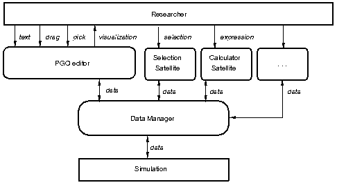 However, the most important satellite is a general purpose satellite for input and visualization of data. Parametrized Graphics Objects (PGOs) are used as the main concept for the general purpose interaction satellite, and the graphics editor as a metaphor for the design of the interface. The graphics editor has two modes:edit and run. In edit-mode, the researcher can create and edit graphics objects much like in MacDraw-like drawing editors. In run-mode, a two-way communication is established between the researcher and the simulation. Data is retrieved from the Data Manager and mapped onto the properties of the graphics objects. Also, the researcher can enter text, drag and pick objects, which is translated into changes of the values of variables in the Data Manager. Hence there is automatic support for the ususally time-consuming and error-prone direct manipulation of graphics objects.