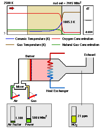 Ceramic foam burners are studied intensively at ECN, both experimentally and computationally. The aim is to realise energy savings and to reduce NOx emissions. A one-dimensional mathematical model has been developed that incorporates a one-step chemical reaction, heat transfer between gas and ceramic, radiation from the burner surface to the surroundings, and radiative heat transfer within the ceramic foam. The CSE has been used to steer those simulations. Oxygen and gas concentrations, ceramic and gas temperatures, as well as the radiation and resulting NOx concentration are displayed. The user can control the surplus of air in the mixture and the desired power. These parameters control the air and gas flow. In the setting shown here, the burner is in a radiant mode: the mixture burns at the downstream edge of the ceramic foam. As a result, the foam heats up, and radiates its energy to the surroundings. This particular interface was developed in half a day, demonstrating that our approach effectively enables researchers to apply computational steering.