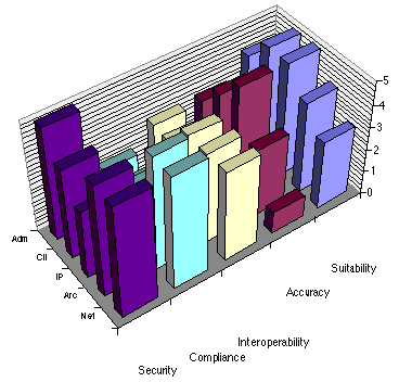 Because of the intrinsic complexity of a modern HIS, it is not convenient to look for a global quality profile (a list of values obtained by assigning a score to each sub-characteristic) by applying the quality model to the whole software system. A broad classification of HIS software components into five categories (Networking, Archiving, Image Processing, Clinical, Administration), according to their functionality, allows us to obtain five separate quality profiles, easier to handle in the evaluation process. The quality profiles result from the application of the ISO/IEC 9126 model as a checklist to define the relevance of each sub-characteristic to each class. For each intersection (quality sub-characteristic, HIS software category) we suggest a value, representing in a five-level scale the relative importance of the sub-characteristic. As an example, Figure 2 shows the quality profile for the Functionality characteristic.