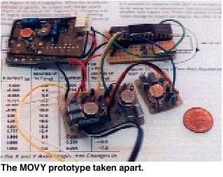 MOVYs are about one tenth the size of the trackers in use today. If mass-produced, MOVYs could be fairly cheap. MOVYs are good at determining orientation. Pitch and roll data have an accuracy of 1.4 degrees. The MOVY prototypes are less good at determining location: location data produced by integrating acceleration data are reliable only in specific situations.Please contact: