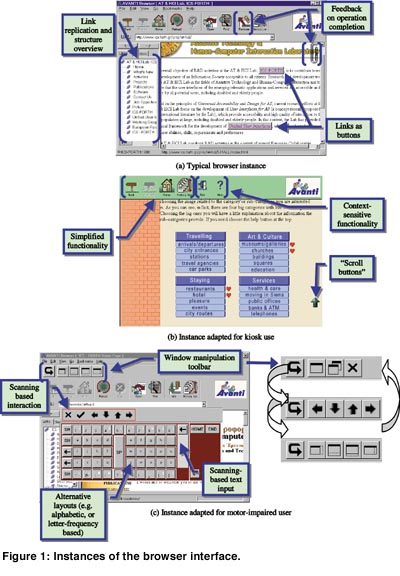 The AVANTI Web browser prototype, developed by ICS-FORTH, is currently the only system known to provide access to the Web for a range of user categories and different contexts of use. Ongoing work involves the support of different platforms and different terminal devices, as well as the compliance to new guidelines and recommendations for User Agents and Web Content Accessibility.