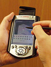 Remote PC Applications on a PDA Deviceby Charles Woodward and Petri Honkamaa The Motion Vector Quantization (MVQ) method developed at VTT enables mobile operation of PC application software from a remote viewing unit. One of the first applications of the method is wireless viewing of 3D CAD models on a PDA device. VTT has during the past years developed a strong video coding technology called MVQ (Motion Vector Quantization). The MVQ method is very light and fast at the receiving end, being especially well suited for implementation on low performance receiving devices and for low bitrate applications. The MVQ method is currently being licensed for international distribution by the companies Oplayo Oy (Finland) and ON-AIR A/S (Denmark). Recently, the scope of video coding has been extended to new applications, ie, streaming moving imagery from computer sofware applications display. The new XVQ (X Windows VQ) method enables users to operate practically any application running on a PC workstation from a remote display unit, such as a PDA device, linked to the computer over a mobile phone connection. Remote 3D CAD Viewing For using the Wireless CAD Viewer, the user first establishes a GSM connection from his/her PDA device to a PC server workstation. The server program running on the workstation launches the View Expert software, supplies file browser information, and starts grabbing View Expert display area to be shown to the PDA user. With the available interaction commands, the client software lets the user rotate, zoom and pan, and ask for distances, angles and radii within the CAD model. Other CAD interaction commands will be straightforward to implement, as well. The XVQ software is highly transparent: in effect, the user gets the feeling of operating straight with the CAD model as it would actually reside on the PDA device. The XVQ method requires much less memory and processing power compared to methods of (down)loading the CAD model locally on the PDA device. The method offers reasonable interaction speed with data transmission rates as low as 5-10 kbits/sec, while the CAD file size is limited only by the computing resources of the server machine. Software Architecture