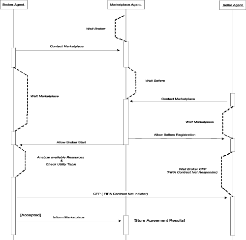 The negotiation between agents for usage of resources is based on the FIPA-Contract-Net protocol, a common protocol used to dynamically create relationships in response to current processing requirements embodied in a contract. The contract is an agreement between a manager (the Broker) and a contractor (the Seller Agent acting on behalf of a Grid resource), resulting from the contractor successfully bidding for the contract.